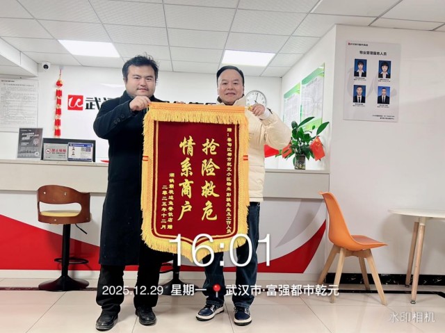 武汉恒昌盛保安服务有限公司义警乐佳、彭骏等人,12月26日在都市乾元执勤时接报有商铺突发火情遂及时赶赴灭火,获赠锦旗致谢
