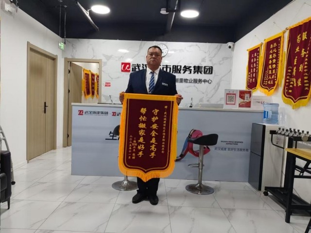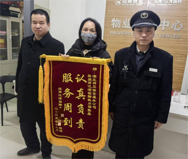 湖北神卫保安服务有限公司秩序队员张晶,12月于招商江湾国际热心助老,获业主赠予锦旗