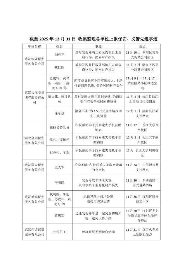 武汉市保安、义警2025年12月先进典型事迹表扬通报
