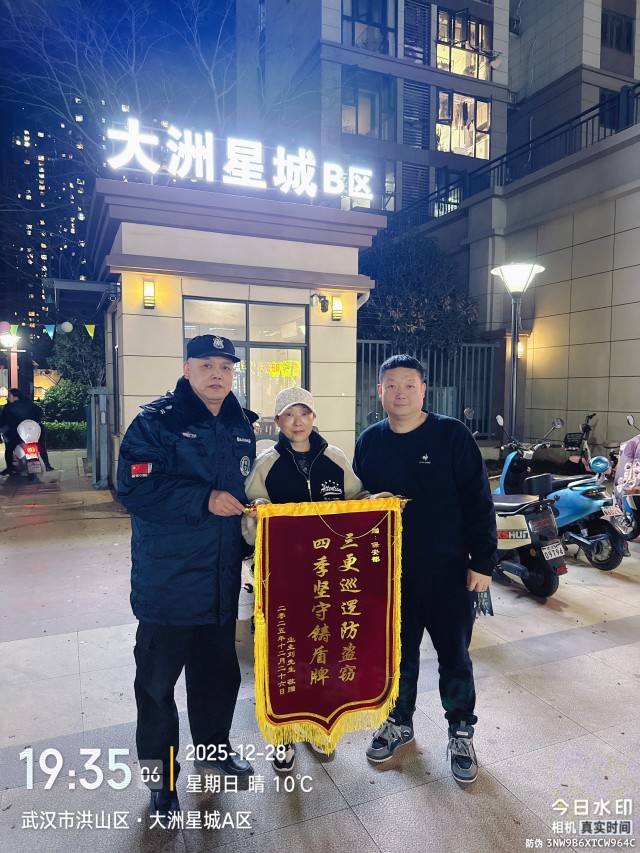 武汉市天盾保安服务有限公司义警队员李伟,12月13日在堤角公园蓬岛区域巡查时拾获财物,多方联动暖心归还,获锦旗赞誉
