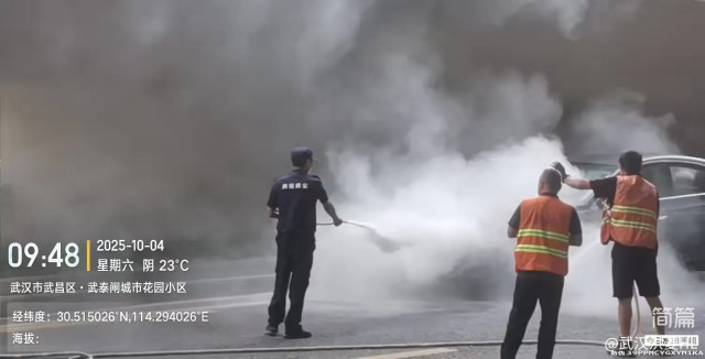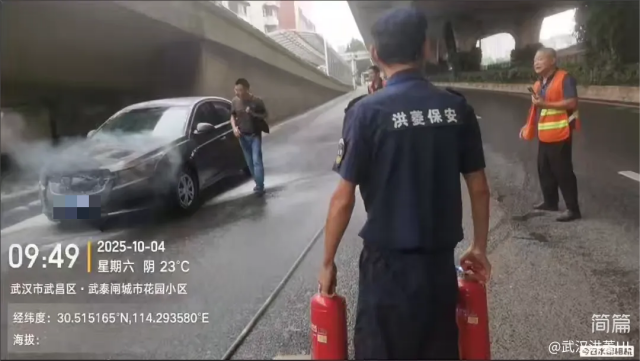 武汉洪菱保安服务有限公司驻派烽火民生汇市场项目保安队长钟辉发现险情后,第一时间向项目经理报备后并冲向现场。他迅速取用灭火器,同时与赶到的环卫洒水车配合,利用灭火设备对起火车辆进行扑救。