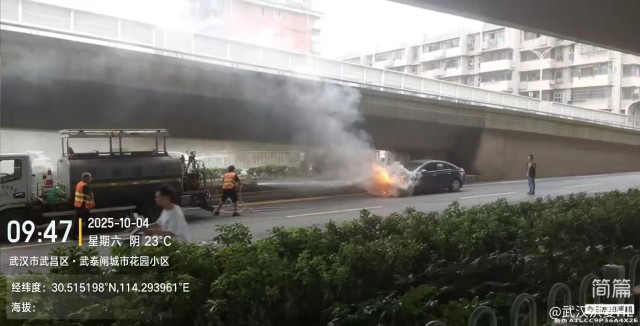10月4日09时47分许,武汉市武昌区烽火民生汇市场对面高架桥下,一辆轿车突发自燃,现场火势凶猛、浓烟滚滚。