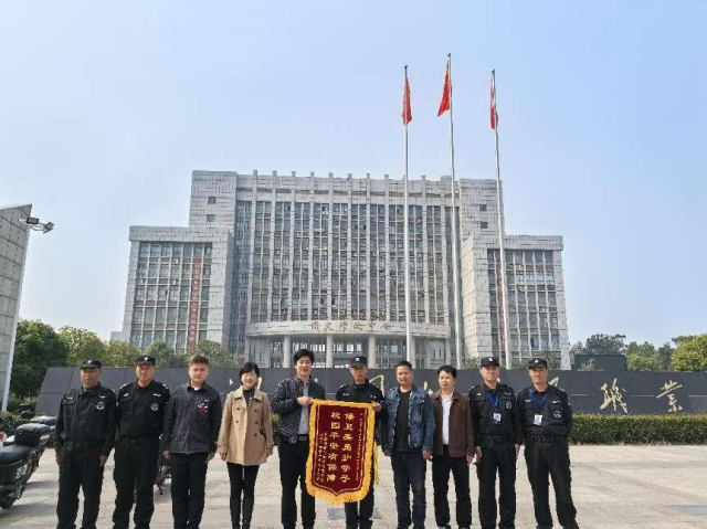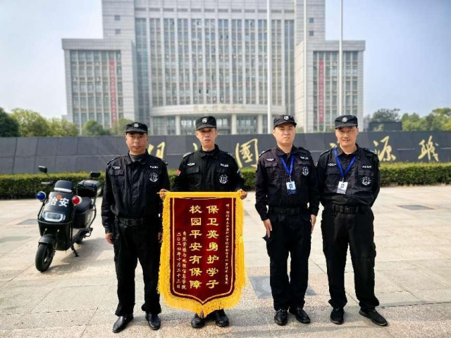 为了表彰中城华鼎驻湖北国土资源学院保安队队员紧要关头挺身而出护学子的壮举,10月28日上午,湖北国土资源学院资信学院院长、书记等领导来到保安队,特赠送“保卫英勇护学子,校园平安有保障”的锦旗一面,以表示对保安队及全体队员“保校平安、勇护学子”的由衷敬佩。