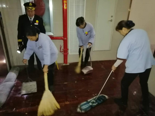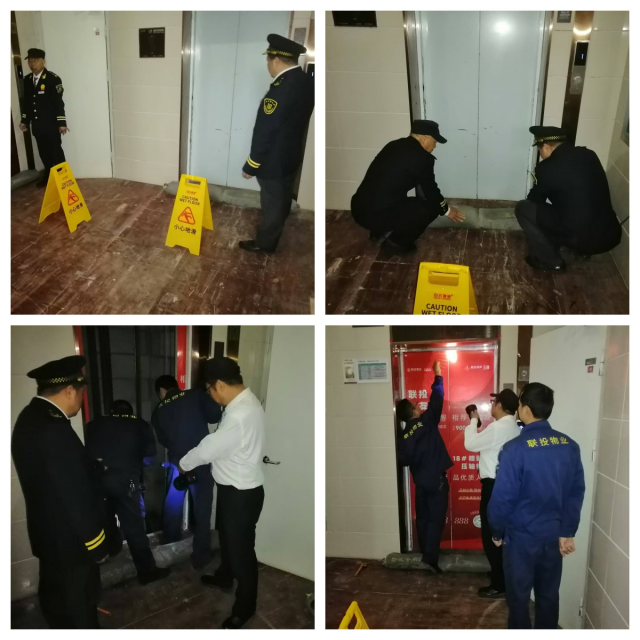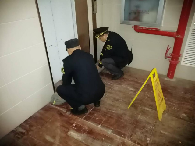 演练真实模拟了一处公共管道突然发生漏水,水势迅速蔓延的紧急情况。为了确保电梯的安全运行,保安队员们迅速行动,立即采取正确措施。他们迅速拿来沙袋有序地堆放在电梯口前,确保有效地阻止水流进入电梯井内。与此同时,保洁人员积极配合,迅速清扫现场积水,细致耐心地做好善后工作。