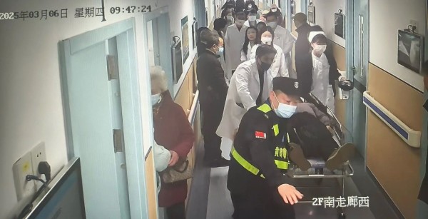 专家们查看满脸鲜血的患者时,发现其意识丧失、呼吸心跳骤停。专家团队随即跪地实施心肺复苏救命,医院各方也迅速联动,为挽救患者生命提供全方位的保障:门诊护士余思婷携带除颤仪,心电图室护士长穆晓春携带心电图机迅速到达现场,保安员袁文和班长一起协助维持诊区秩序。