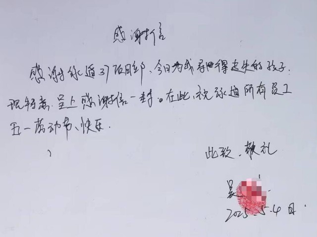 5月4日14时24分,东湖绿道三期秩序部安保队员付国学在凌波门区域例行巡查时,发现一名神情焦急的10岁男童独自徘徊。经询问得知,该名儿童与家长走散,正不知所措。队员付国学立即将孩子带到景区太空舱休息区安抚情绪,并通过多方协调,以及项目内部工作群多方联动寻找家长。半小时后,心急如焚的家长匆忙赶至,对李明连声道谢,并写下感谢信称赞其“细致负责,守护游客安全”。