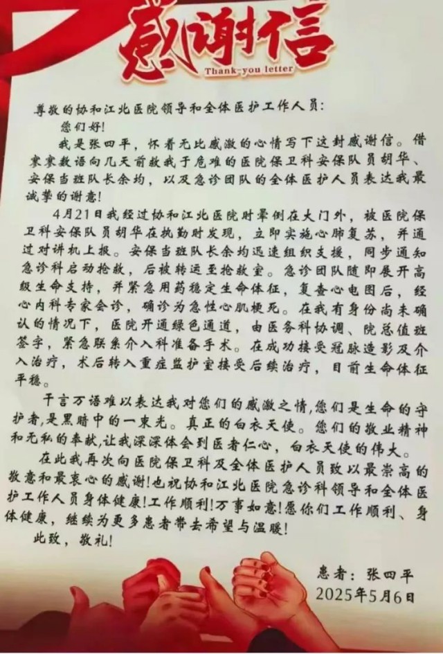 据信中所述,4月21日,患者张先生途经蔡甸区人民医院,突发急性心梗晕倒在医院的大门外,院区保安队员胡华在执勤时发现了这一异常现象,立即飞步上前给男子实施心肺复苏,并通过对讲机向当班队长余均上报。队长迅速组织队友紧急集合前往援助,同时通知医院急诊科启动抢救。