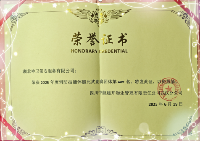 6月19日,建开物业武汉分公司消防技能体能比武竞赛落下帷幕。湖北神卫保安服务有限公司代表队凭借卓越的专业技能与团队协作能力,在五项竞技项目中脱颖而出,以优异成绩斩获赛事桂冠。四川中航建开物业管理有限责任公司武汉分公司为其颁发荣誉证书,表彰其在消防应急能力建设中的突出表现。