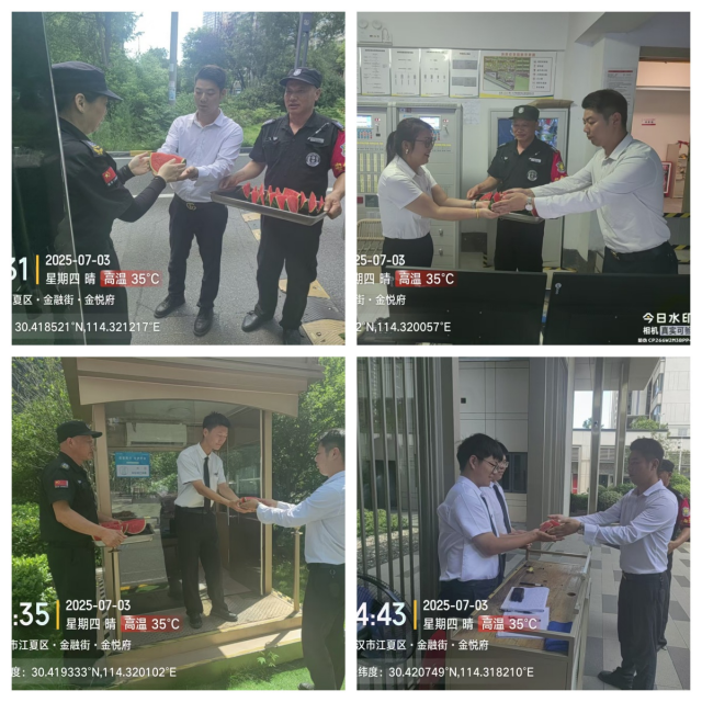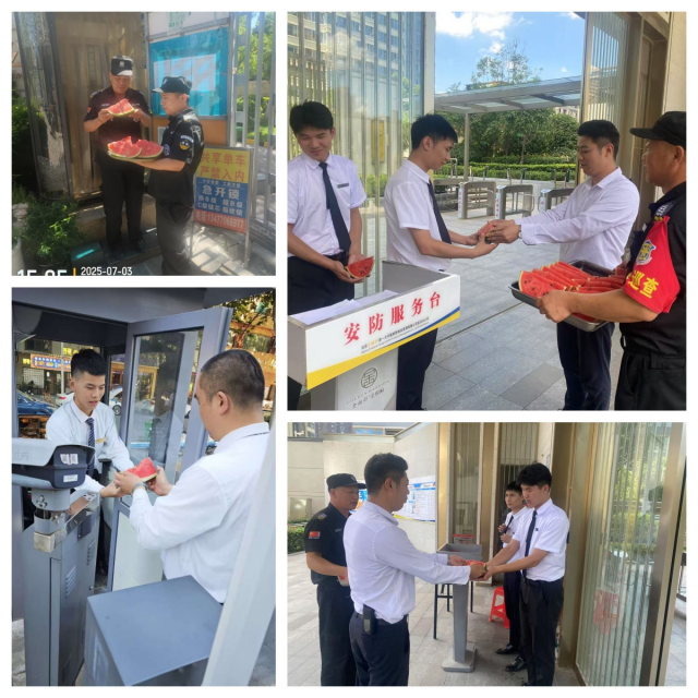 面对持续的高温“烤”验,湖北神卫保安服务有限公司项目总白富积极行动起来,为项目上的每一位保安员安排了送清凉活动。为每个项目安排西瓜,绿豆汤,解暑饮料等物资,保障每一位保安员的健康,并为他们宣传中暑预防和急救知识,提醒每一位保安员做好自我防护工作,每天及时补充水分,确保安全度夏。
