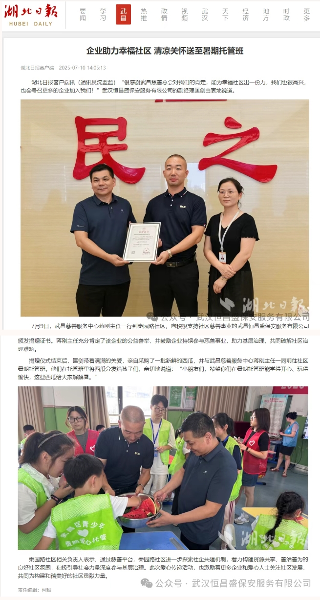 武汉恒昌盛保安服务有限公司作为武汉本土企业,始终牢记社会责任,积极投身公益事业。此次行动不仅为幸福社区的建设添砖加瓦,更让孩子们在炎炎夏日感受到了清凉与关爱。未来,恒昌盛将继续践行社会责任,带动更多企业参与到公益事业中来,为构建和谐美好的社区贡献更多力量。而湖北日报的大力报道,也让这份爱心与担当被更多人知晓,激励着更多社会力量关注社区发展,共同书写幸福社区的美好篇章!