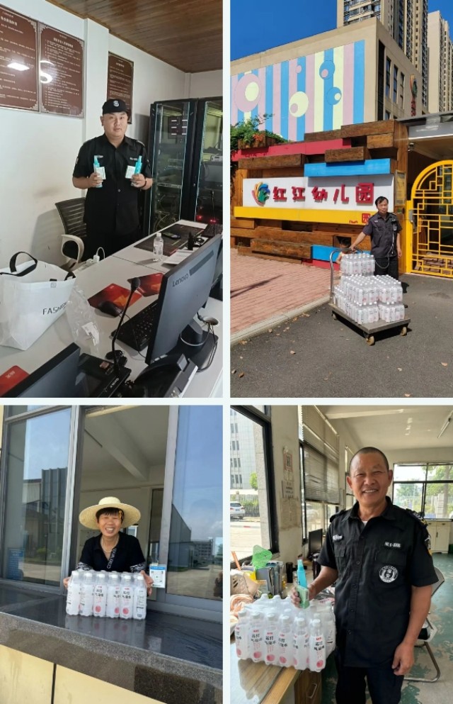 上午八点半,公司总经理王德平、常务副总代勇刚、工会主席应选忠及其他管理人员一行带领慰问小组兵分三路深入各基层保安执勤岗点,如大汉阳有轨电车岗点、小区保安亭、学校保安室、工厂门卫室等,将精心准备的近2000份“清凉礼包”送到每一位保安队员手中。礼包内包含了盐汽水、花露水、人丹、藿香正气水等防暑降温用品,每一份都承载着公司对基层员工的满满关爱。